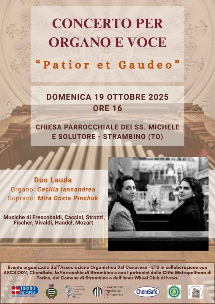 L’evento, organizzato dall’Associazione Organistica Del Canavese – ETS (AODC) in collaborazione con ASCS ODV, ChemSafe S.r.l., la Parrocchia di Strambino e con i patrocini della Città Metropolitana di Torino, del Comune di Strambino e dell’Inner Wheel Club di Ivrea, si propone di valorizzare la voce del grande organo Serassi 1808-1865 di Strambino, senza dubbio uno dei più prestigiosi e rappresentativi sul territorio canavesano e non solo, con una compagine artistica come quella del Duo Lauda dal forte valore simbolico nell’ambito della parità di genere declinata al mondo musicale e in particolare organistico.